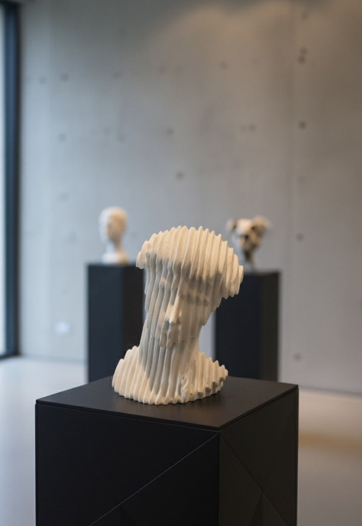 Transform your living space with The Ribbed Muse. This avant-garde bust sculpture features a unique vertically-slatted design that creates a mesmerizing 3D visual effect, making it look like it's shifting with the light. Designed for the sophisticated Pakistani home, it is a perfect blend of a traditional portrait bust and futuristic architectural design.